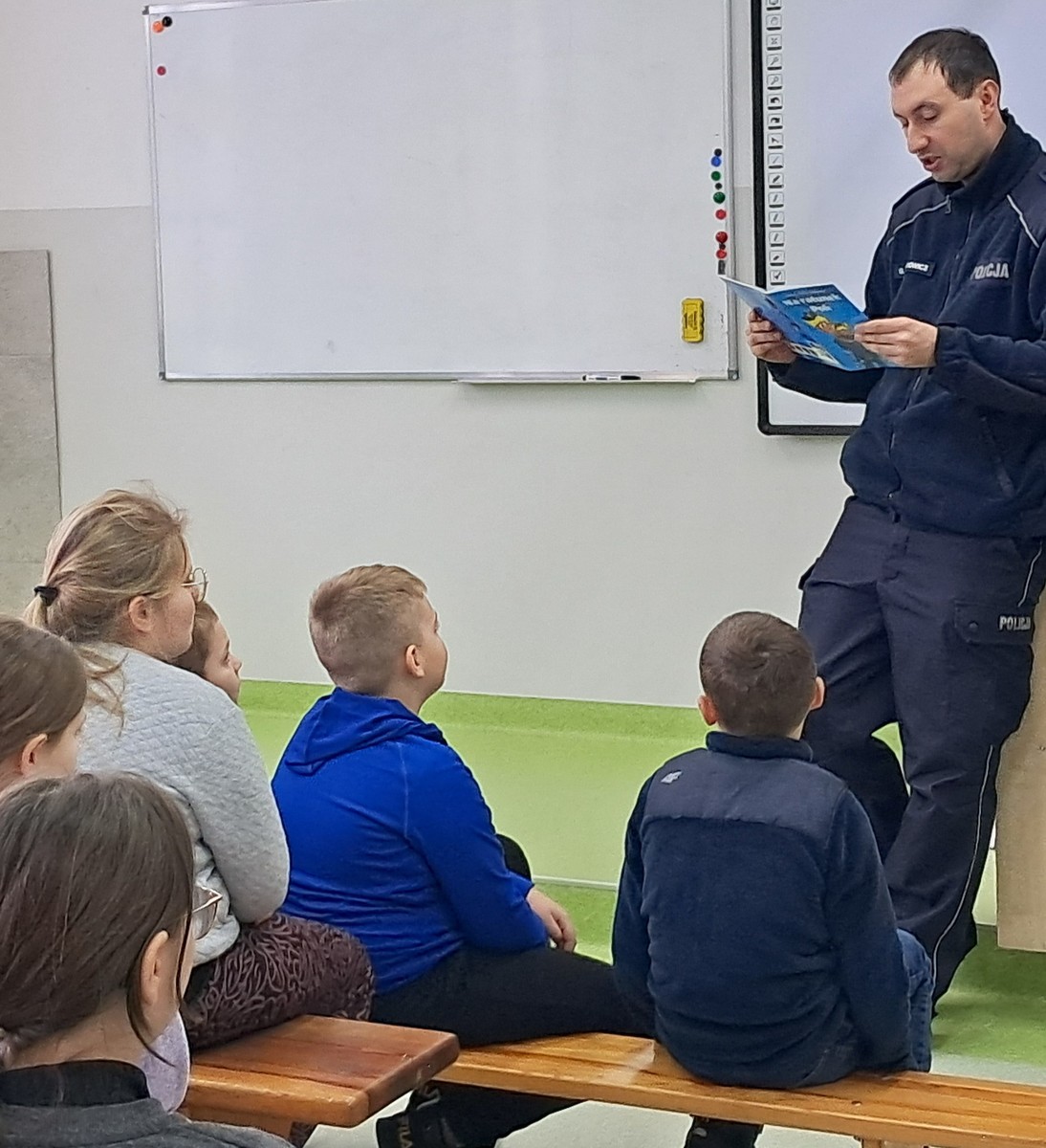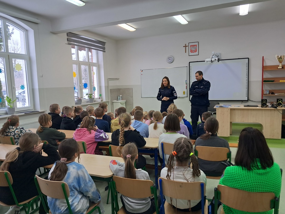 W środę (17.01.2024 r.) policjantka z Zespołu Profilaktyki Społecznej z Komendy Powiatowej Policji w Szczytnie st. sierż. Joanna Manelska oraz dzielnicowy gminy Dźwierzuty mł. asp. Grzegorz Trojanowicz odwiedzili uczniów Zespołu Szkół w Orzynach. Funkcjonariusze przypomnieli dzieciom o tym, jakie zagrożenia mogą ich spotkać w Internecie, a także podczas zimowych zabaw na podwórku. Dzielnicowy przeczytał młodszym dzieciom opowieść o Poli, która weszła na lód mimo tego, że było to niebezpieczne.