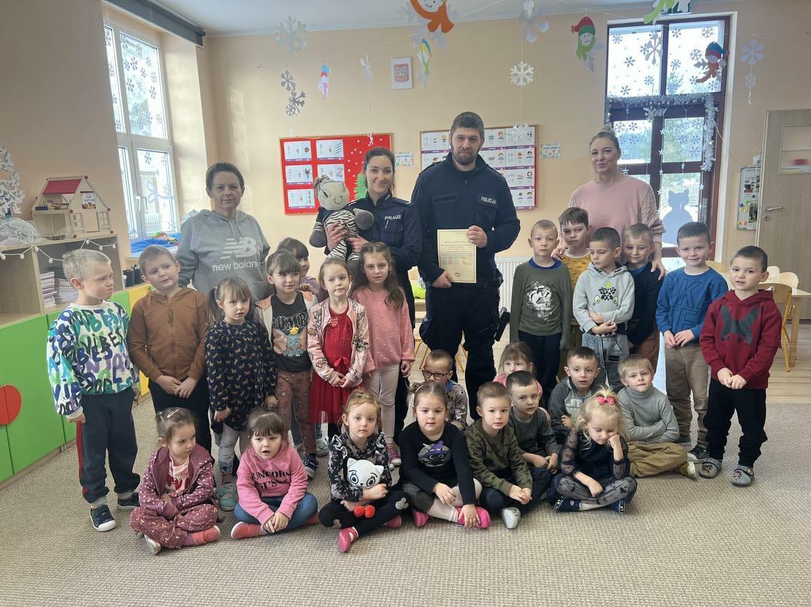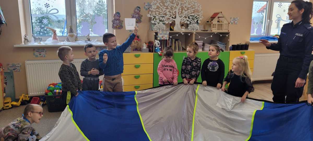 Gminne Przedszkole w Nowinach w piątkowy ranek (19.01.2024 r.) odwiedziła sierż. Emilia Pławska wspólnie z dzielnicowym gminy Szczytno sierż. sztab. Kamilem Szczepankiem. Funkcjonariusze poprzez wykorzystanie kolorowych ilustracji przypomnieli przedszkolakom zasady bezpieczeństwa przed zbliżającymi się feriami oraz opowiedzieli o sytuacjach, w których należy dzwonić pod numer alarmowy 112. Następnie sierż. sztab. Kamil Szczepanek również przeczytał przygodę bohaterki książki Poli. Na koniec dzieci utrwaliły zasady bezpieczeństwa poprzez zabawę z wykorzystaniem chusty animacyjnej.