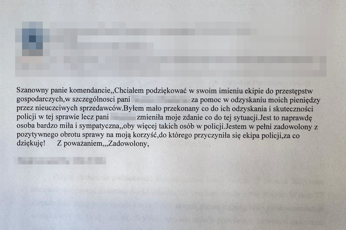 Pierwsze z podziękowań dotyczy interwencji, w wyniku której funkcjonariusze pomogli mieszkańcowi odzyskać utracone pieniądze. Dzięki podjętym przez nich szybkim i zdecydowanym działaniom udało się doprowadzić do pomyślnego zakończenia sprawy.
