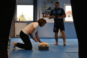 W części praktycznej uczestnicy mieli okazję poznać i przećwiczyć podstawowe techniki samoobrony, które mogą pomóc w uniknięciu lub ograniczeniu skutków niebezpiecznych zdarzeń. Z kolei w module poświęconym pierwszej pomocy policjant omówił zasady postępowania w przypadku utraty przytomności, zadławienia, zranienia czy zatrzymania krążenia. Uczestnicy ćwiczyli resuscytację krążeniowo-oddechową na fantomie.
