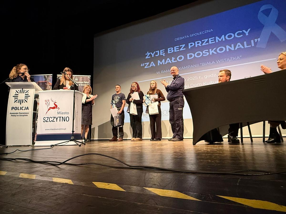 W Miejskim Domu Kultury w Szczytnie odbyła się debata społeczna pod hasłem „Żyję bez przemocy. Za mało doskonali”. Spotkanie zorganizowane zostało w ramach kampanii „Biała wstążka” przez Komendę Powiatową Policji w Szczytnie oraz Miejski Ośrodek Pomocy Społecznej w Szczytnie. W wydarzeniu uczestniczyli przedstawiciele służb, instytucji, nauczyciele oraz młodzież szkół ponadpodstawowych ze Szczytna. Debata była okazją do rozmowy o presji doskonałości, bezpieczeństwie emocjonalnym i znaczeniu wzajemnego wsparcia.