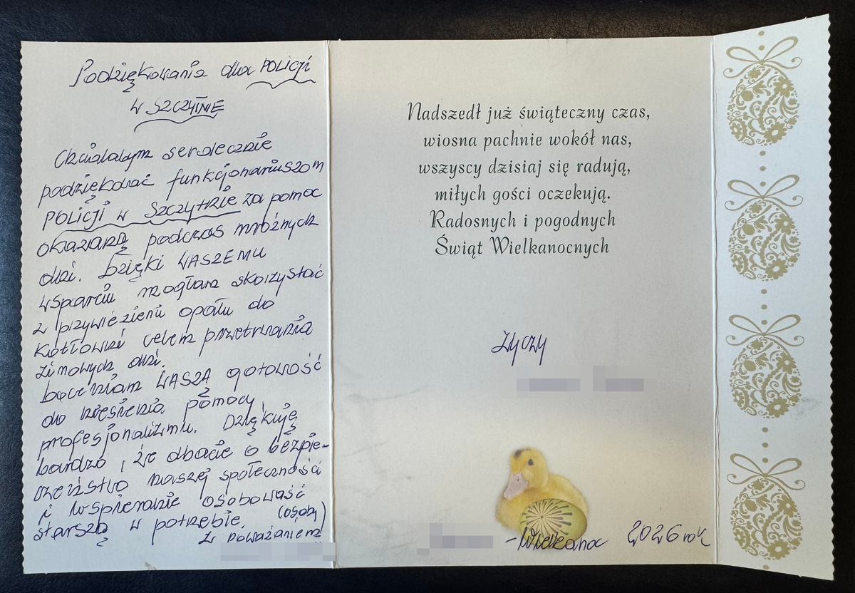 Za zaangażowanie oraz okazaną pomoc policjanci otrzymali wyjątkowe podziękowania. Jedna z mieszkanek gminy Świętajno, doceniając trud i poświęcenie funkcjonariuszy, przesłała do jednostki życzenia wielkanocne wraz z wyrazami wdzięczności za niesioną pomoc.