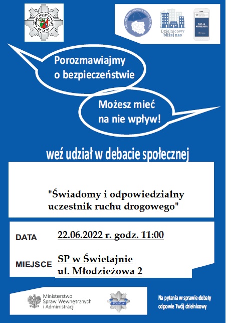 Mieszkańcy Gminy Świątajno oraz Gminy Rozogi zaproszeni są przez szczycieńskich funkcjonariuszy Policji na Debatę społeczną organizowaną w dniu 22.06.2022 r. w godz. 11:00-13:00 w Szkole Podstawowej im. I. Krasickiego w Świętajnie na ul. Młodzieżowej 2. Debata poświęcona będzie tematom związanym z bezpieczeństwem w ruchu drogowym pt. "Świadomy i odpowiedzialny uczestnik ruchu drogowego".
