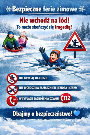 Zbliżające się ferie zimowe to czas odpoczynku, zabawy i aktywności na świeżym powietrzu. Aby zimowy wypoczynek był radosny i bezpieczny, warto przypomnieć dzieciom o podstawowych zasadach bezpieczeństwa, zwłaszcza tych związanych z zabawą w pobliżu zbiorników wodnych i wchodzeniem na zamarznięty lód.